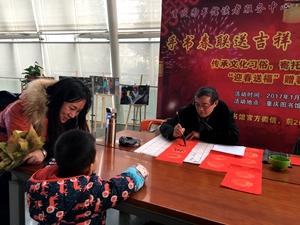 随着生活节奏加快,机器印刷的春联如今非常普及。但传统的手写春联却蕴藏着不可取代的文化内涵和温情厚意,这其中最重要的就是它对书法魅力的传承。1月22日下午,重图读者服务中心特邀三位书法爱好者来到现场,泼墨挥毫,为广大市民手书春联送吉祥。活动现场,大红烫金纸,淡淡徽墨香,人头攒动,年味十足。活动持续了三个小时,为市民送出春联200余幅。此次活动还吸引了许多小朋友,让孩子们也感受一下书法文化的熏陶。本次活动不仅弘扬了写春联的民俗文化,更为市民朋友们送上了诚挚的新年祝福,受到大家的一致好评。